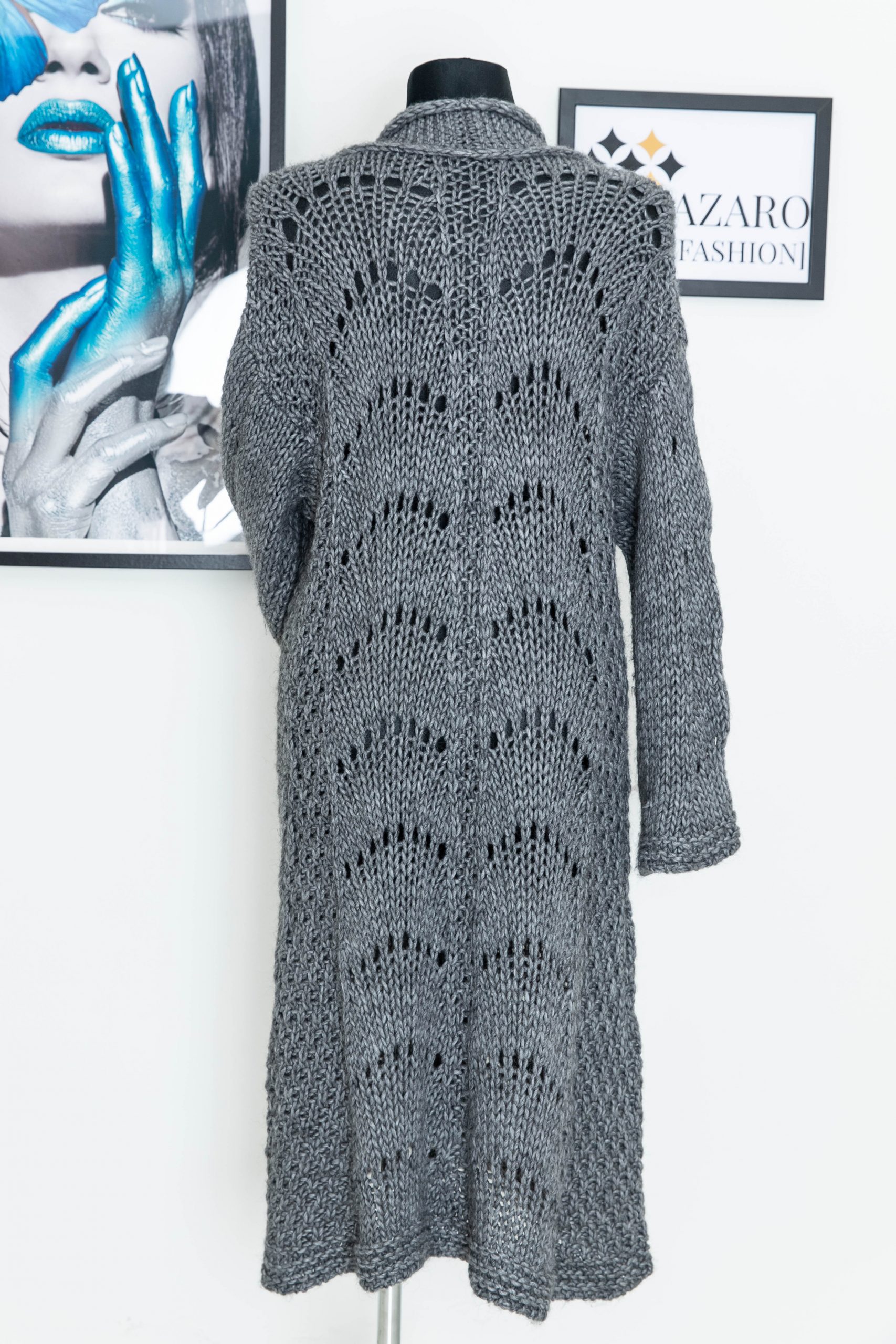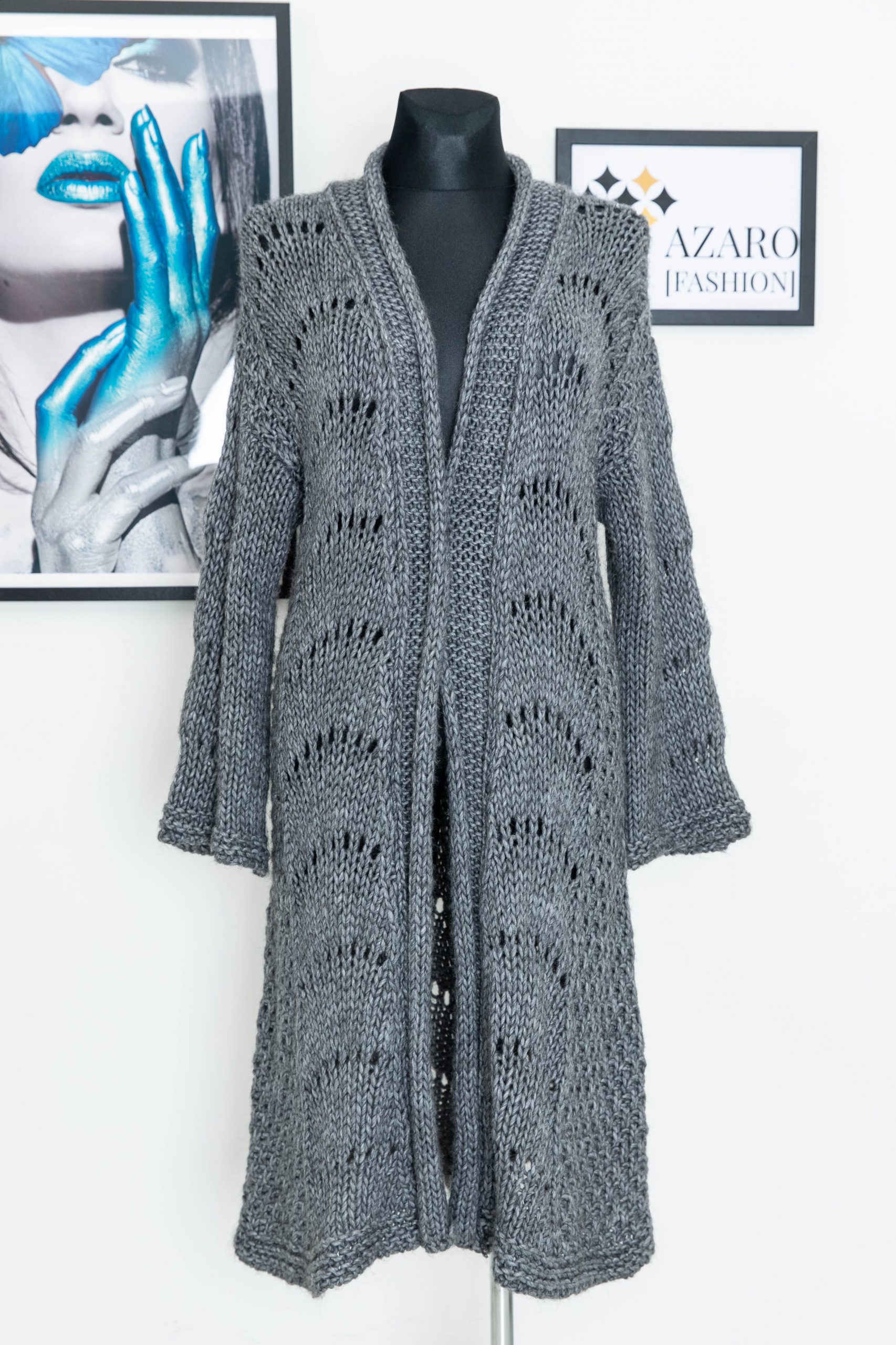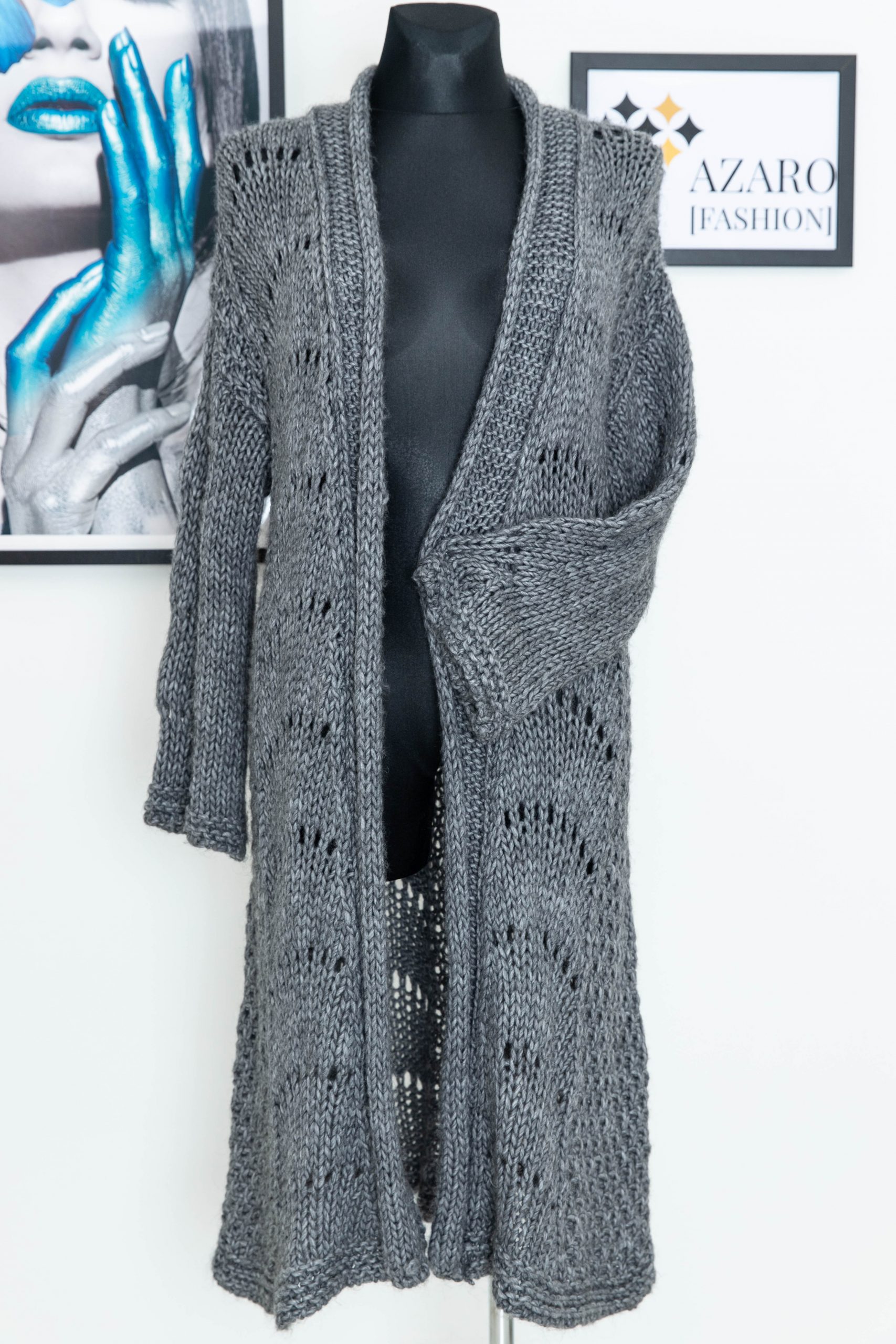 Szary, ekskluzywny, długi kardigan w ozdobne warkocze.